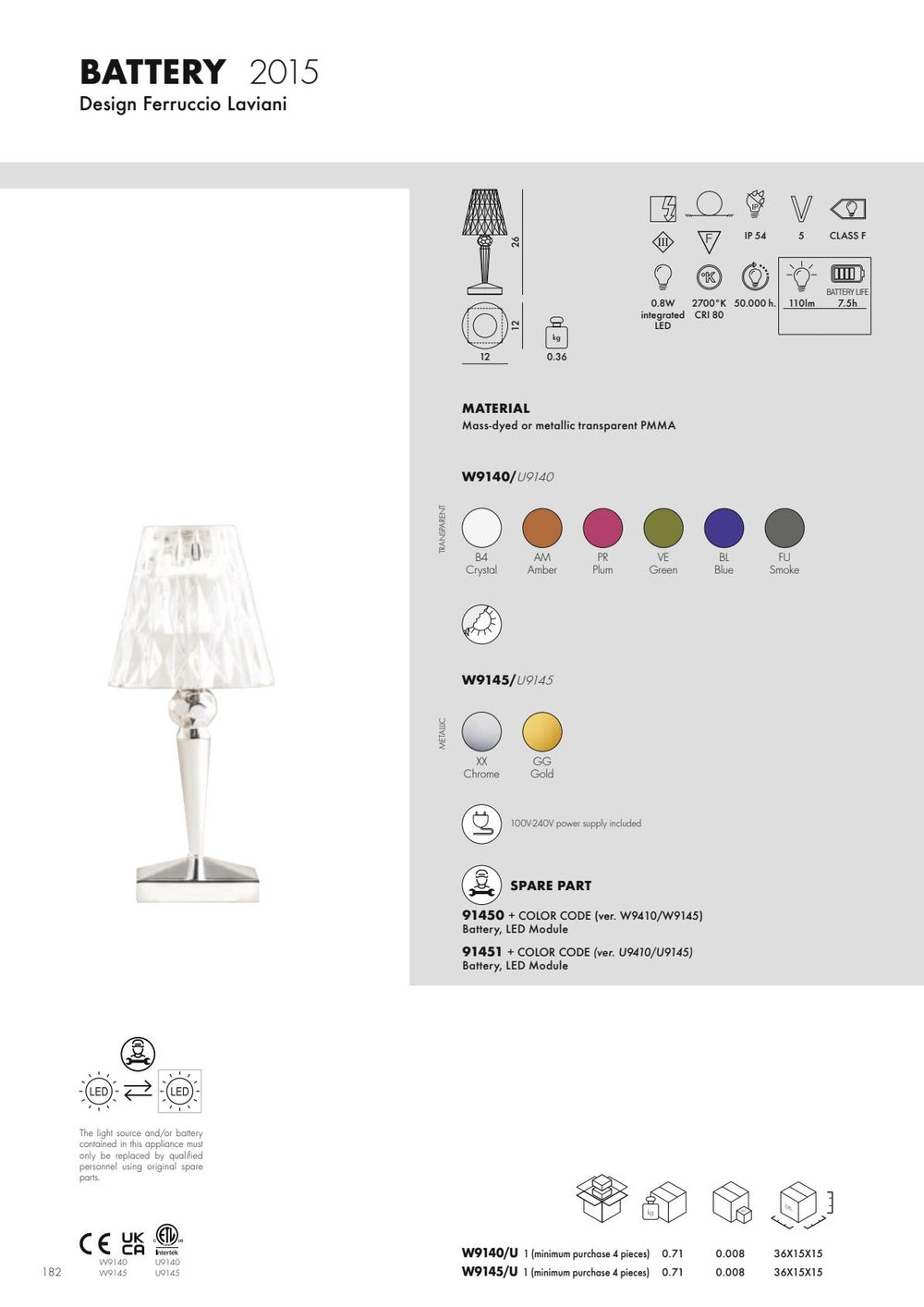 Το Battery είναι ένα εμβληματικό αμπαζούρ με τις περιορισμένες διαστάσεις,απο διάφανο PMMA του οποίου η μεγάλη καινοτομία είναι οτι πρόκειται για 100% επαναφορτιζόμενο μέσω καλωδίου USB με αυτονομία περίπου μέχρι 6 ώρες.Αυτό της δίνει τη δυνατότητα να μετακινείται εύκολα: ιδανική για το contract,για χρήση σε εξωτερικούς χώρους. Η σειρά Battery έχει ένα καπέλο χρώμα κρύσταλλο με πολυεδρική επιφάνεια που κάνει πανέμορφα παιχνιδίσματα στο φως,με σκελετό σε δύο διαφορετικούς κομψούς χρωματισμούς μετάλλου χρυσό και ασημένιο. Σε αυτές προστίθεται και η έκδοση αποκλειστικά σε διάφανους τόνους.